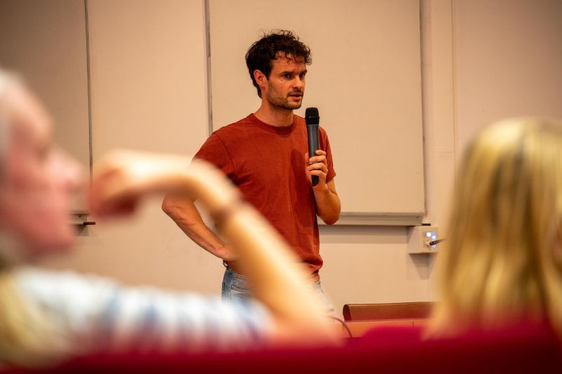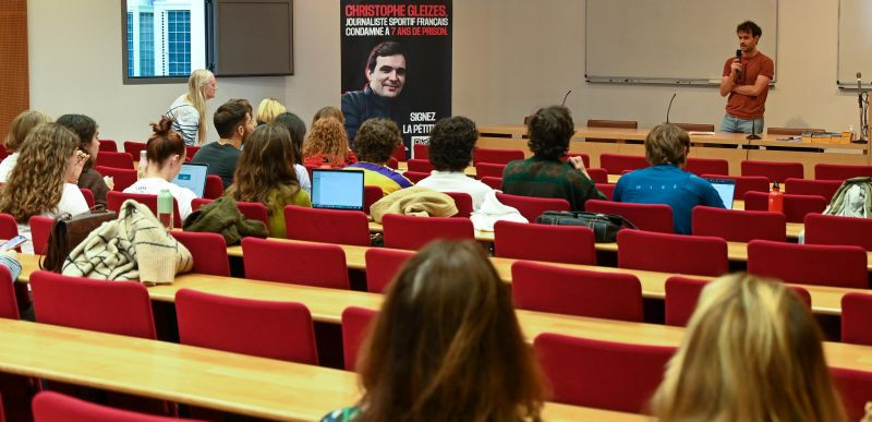 Dans le grand amphi du CELSA, une intervention de Barthélémy Gaillard, membre de son comité de soutien, diplômé journaliste du CELSA et camarade de promotion de Christophe, a été organisée devant les étudiants en journalisme et communication du CELSA, les enseignants et les équipes administratives.